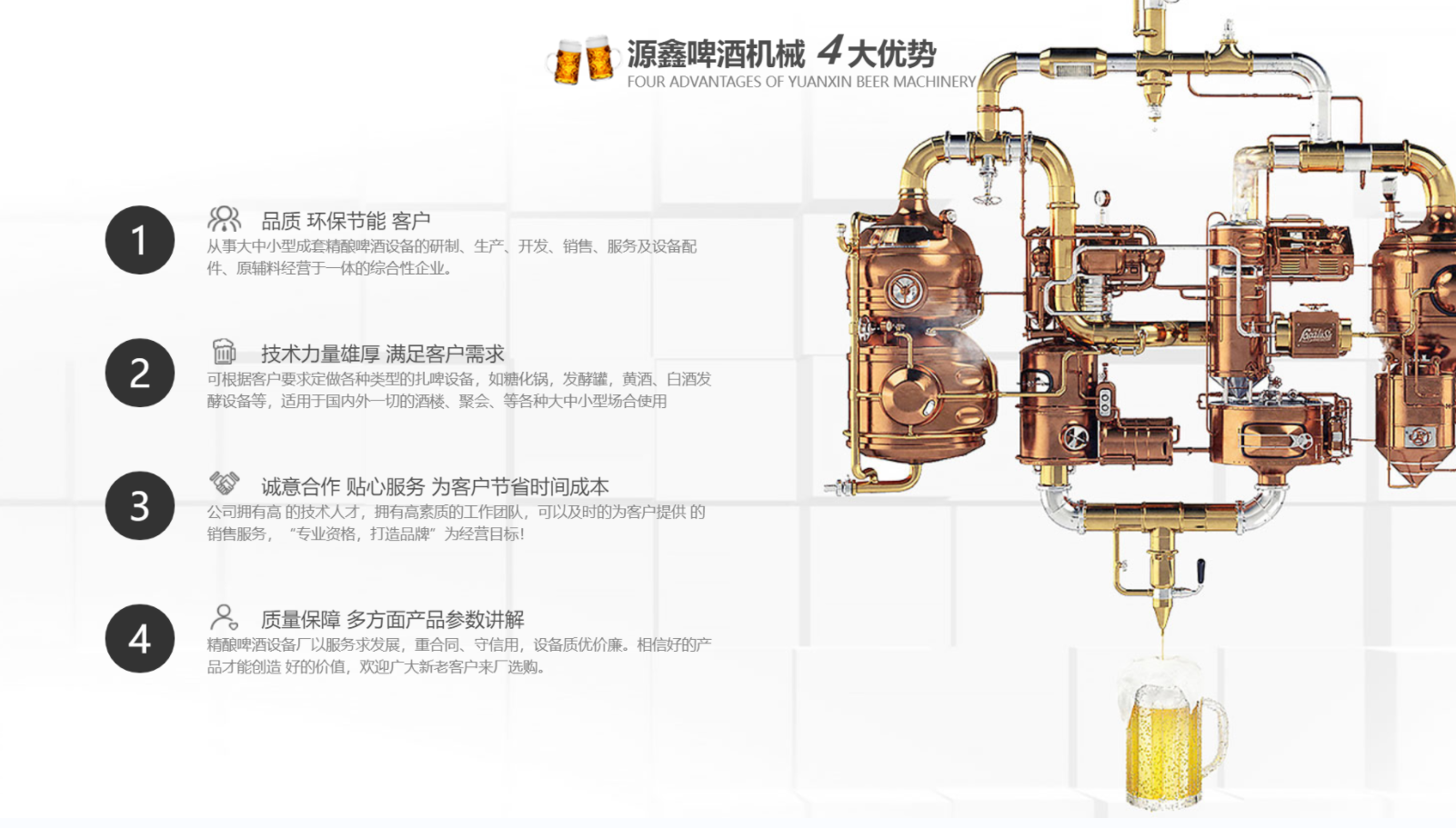 南陽(yáng)市源鑫啤酒機(jī)械設(shè)備有限公司位于歷史文化名城一-南陽(yáng),從事大中小型成套啤酒、白酒自釀設(shè)備的研制、生產(chǎn)、開(kāi)發(fā)、銷(xiāo)售、服務(wù)及設(shè)備配件、原輔料經(jīng)營(yíng)于一體的綜合性企業(yè)。公司可根據(jù)客戶(hù)要求定做各種類(lèi)型的扎啤設(shè)備,如糖化鍋,發(fā)酵罐,黃酒、白酒發(fā)酵設(shè)備等,適用于國(guó)內(nèi)外一切的酒樓、餐廳、家庭.聚會(huì)、酒吧等各種大、中、小型場(chǎng)合使用。公司擁有技術(shù)人才,擁有高素質(zhì)的工作團(tuán)隊(duì),可以及時(shí)的為客戶(hù)提供**的銷(xiāo)售服務(wù)。公司以“專(zhuān)業(yè)資格,打造品牌”為經(jīng)營(yíng)目標(biāo),“卓越質(zhì)量,信賴(lài)價(jià)格”為經(jīng)營(yíng)宗旨,以質(zhì)量求生存,以服務(wù)求發(fā)展,重合同、守信用,設(shè)備質(zhì)優(yōu)價(jià)廉。相信好的產(chǎn)品才能創(chuàng)造 好的價(jià)值,歡迎廣大新老客戶(hù)來(lái)廠選購(gòu)。...